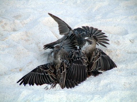 This is two gangs of Mocking Birds fighting. They would stand about two feet from each other and caw at each other. There were three on one side and two on the other. Every so often they would charge each other and fight.